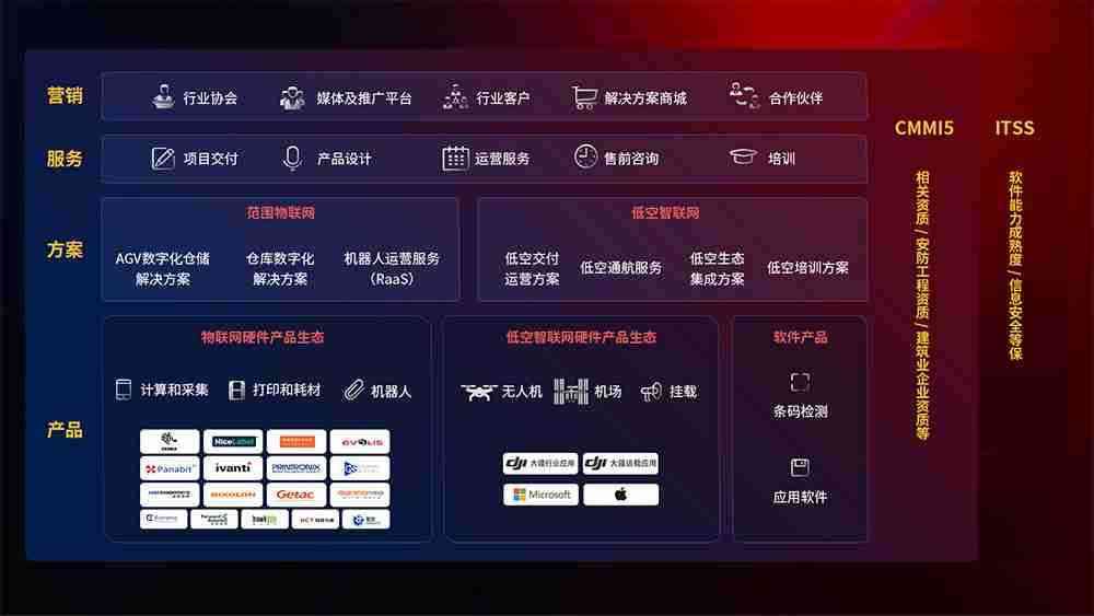 聚合国内外先进的物联网硬件产品品牌,,,聚焦数字化仓储、、、机器人运营、、低空智联网等领域,,,共同打造适合客户业务场景的解决方案并提供交付服务