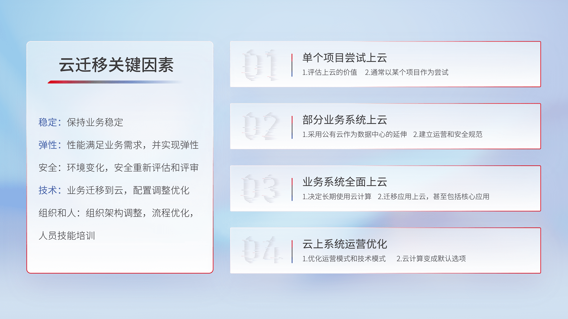 结合实际业务,,,,从规划设计、、云平台选型、、、、云原生改造、、、数据迁移、、集成交付,,,迁移全过程为客户识别最佳上云路径,,,做好风险识别管理,,,设计网络架构、、身份权限、、、、安全审计合规、、、、操作审计、、日志审计、、、、监控告警策略、、、、多站点容灾设计等,,,对云上基础设施进行整体规划,,,提升IT治理水平,,,以满足弹性、、高可用、、、、高性能的需求。。。。