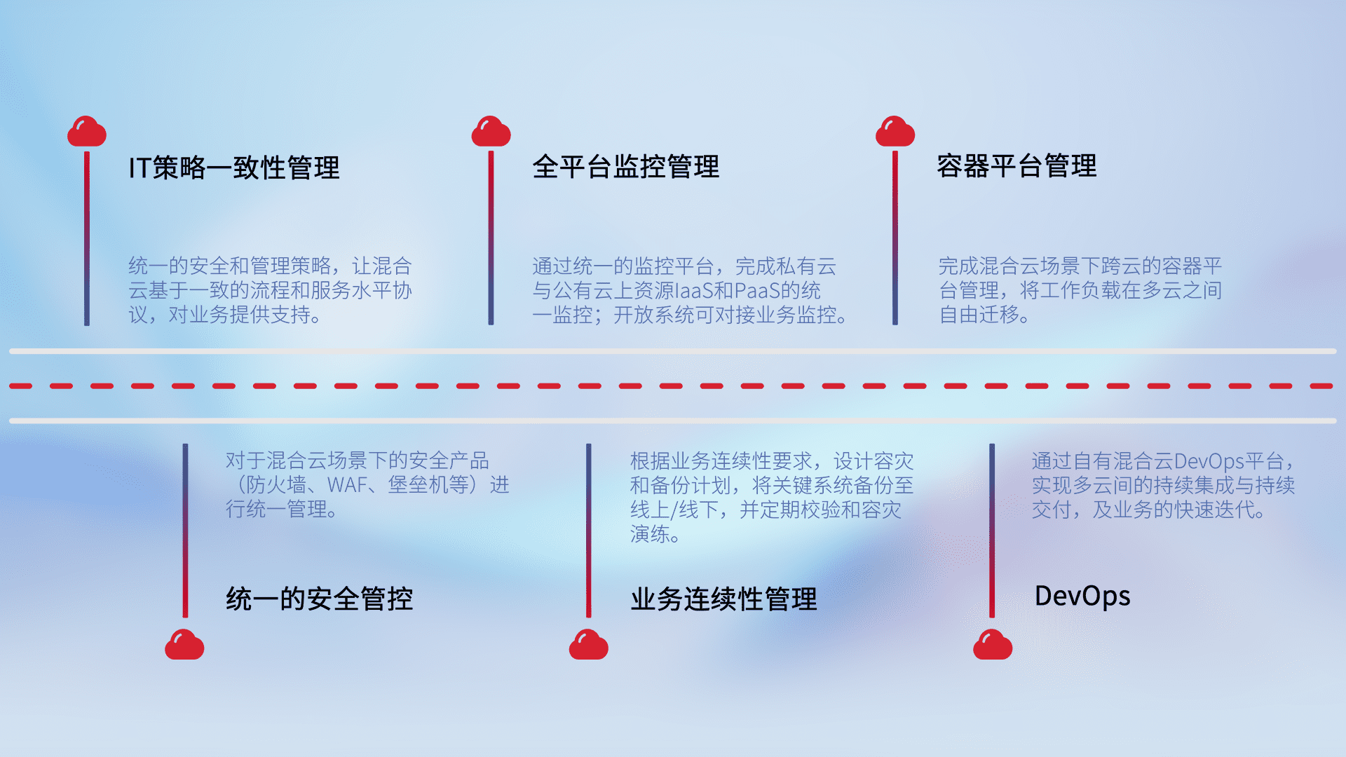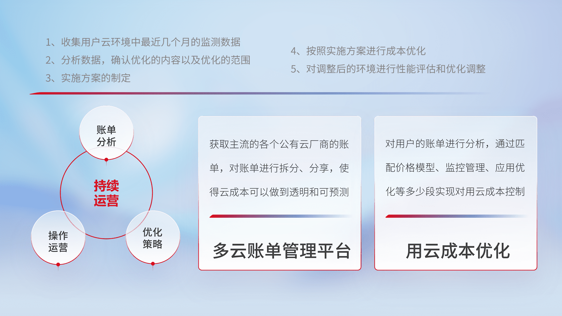 通过多云纳管,,,,以统一的资源数据模型把客户的云资源进行抽象和封装,,进而实现对多云资源的统一操作,,保障云资源管理的可靠性、、稳定性与可用性。。。量身定制化运维内容,,配置、、、开发运维、、补丁管理、、备份、、、、监控、、认证和访问管理、、、、审计和日常巡检等,,,保障在用云过程中的可靠度,,,稳定度以及高可用率。。