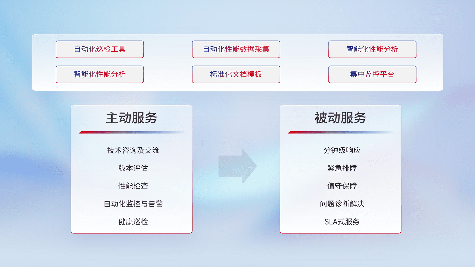 智能化工具和标准化文档,,保障服务质量,,,,提供主动服务(包含技术咨询、、、、版本评估、、、、性能检查、、、自动化监控与告警、、、健康巡检)和被动服务包含(分钟级响应、、、、紧急排障、、、、值守保障、、问题诊断解决、、、SLA服务)。。
